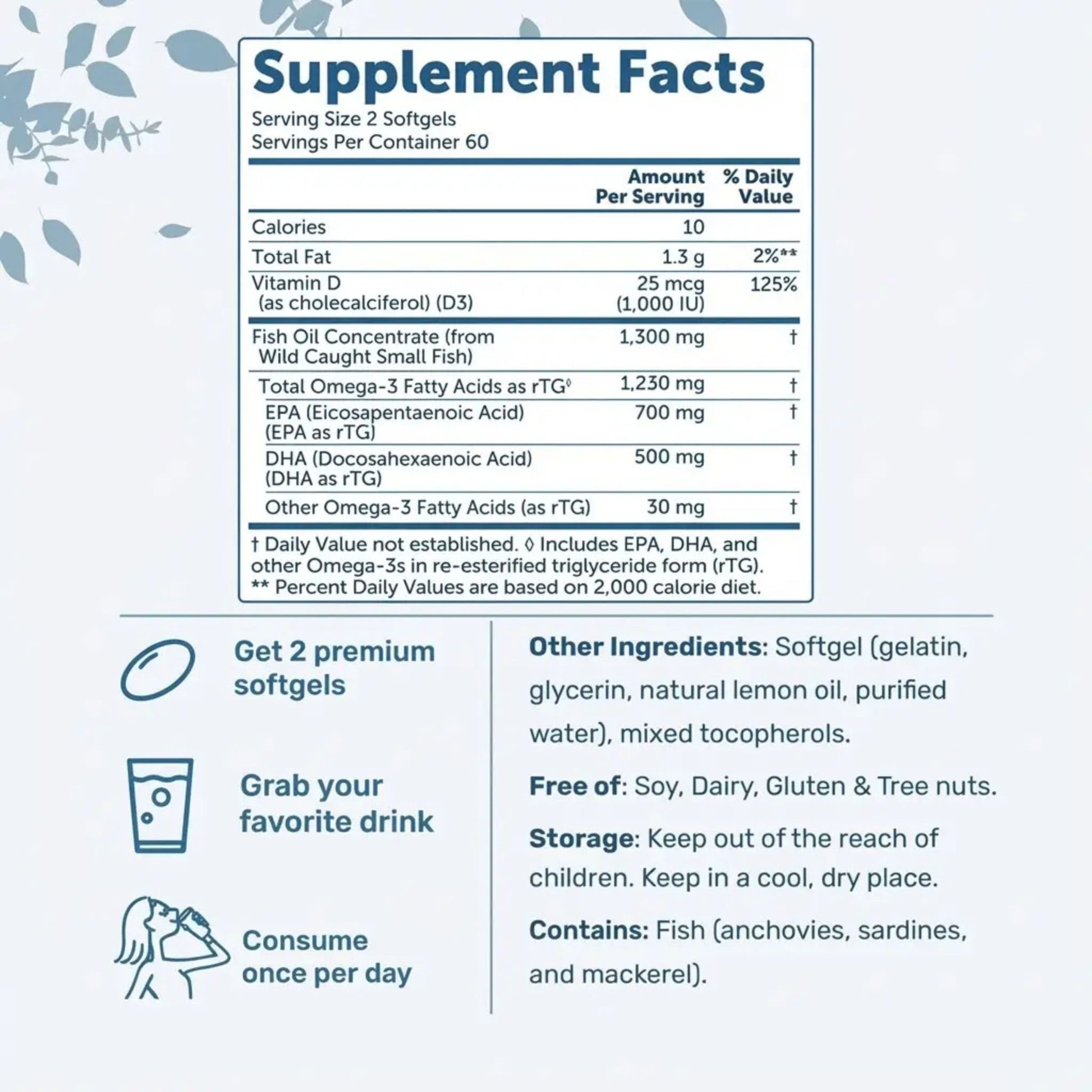 Dosage: Take 2 softgels daily with food (one serving = 1,300mg of omega-3s)